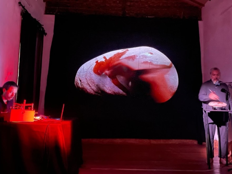 En este performance, lo corporal se configura como caja de resonancia y dibujante de voces y recuerdos, que desde traducciones visuales y sonoras devela fotogramas y grafías de recuerdo y saudades elaboradas con el elemento esencial, el agua, sobre la superficie caliente de la piedra, que se configurará en esta acción como lienzo infinito para insistir en la imagen, el recuerdo en el contrarreloj del tiempo, como ritornelo de la memoria colectiva y cuerpo social en ausencia.