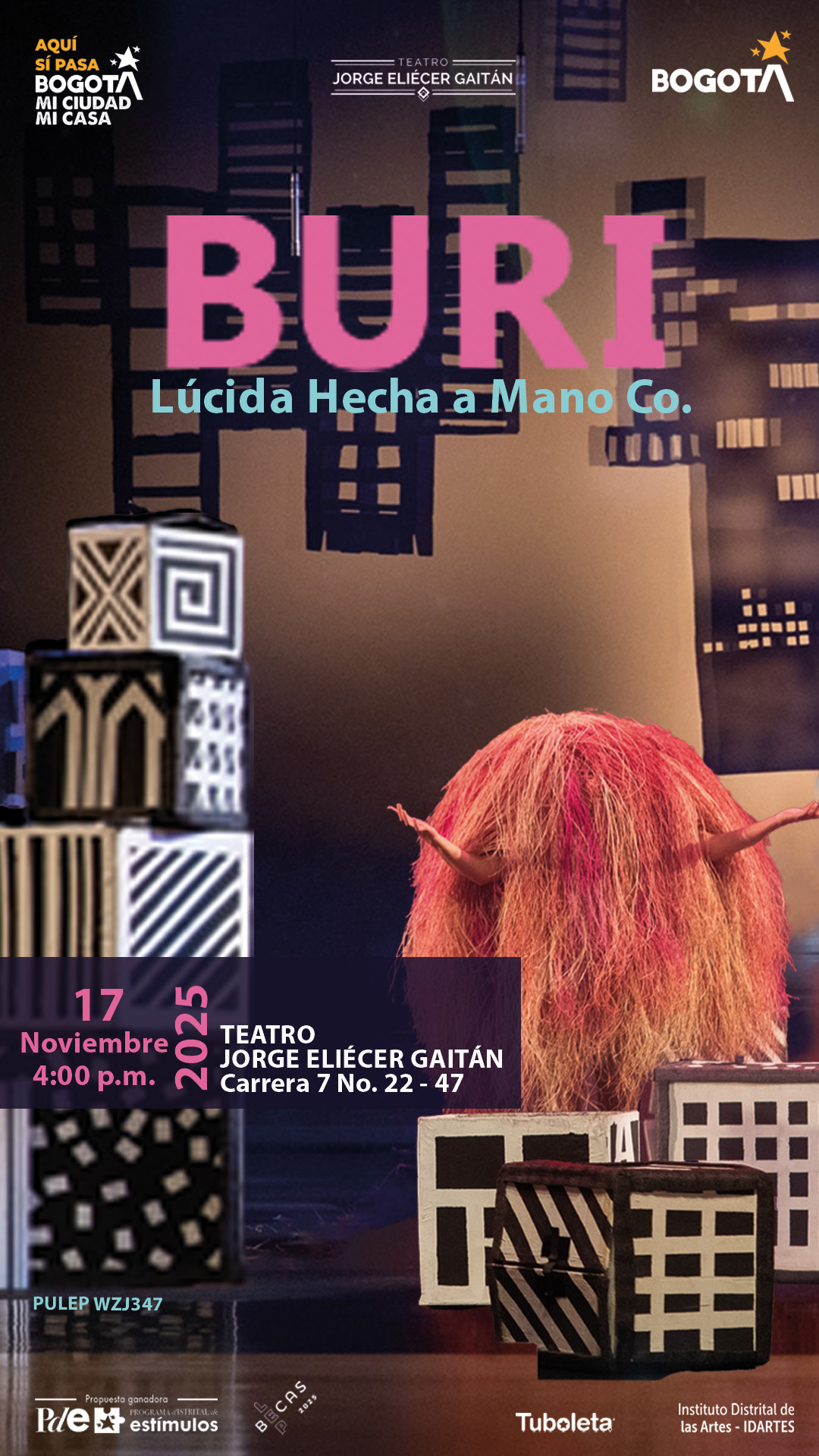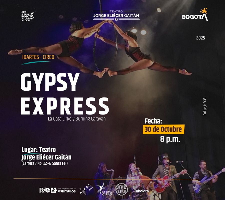 Durante octubre y noviembre, el Teatro Jorge Eliécer Gaitán abre su escenario a cuatro producciones ganadoras de las Becas de la Ley de Espectáculos Públicos (LEP), que celebran la fuerza creativa, la diversidad cultural y la innovación artística de Bogotá. Circo, música, teatro y experiencias multisensoriales se darán cita en este emblemático escenario para el disfrute de todos los públicos. Gypsy Express, María Mulata y Nicoyembre en concierto y para el gran cierre Buri.